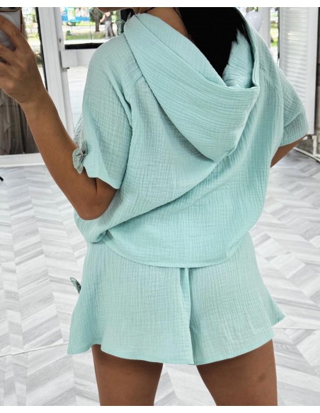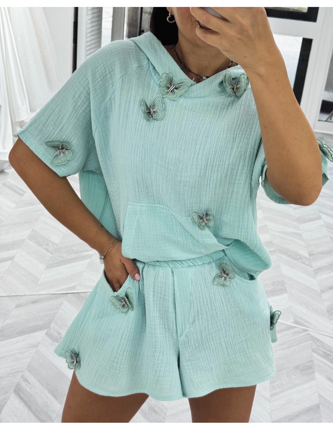 pantalon evazat si bluza cu maneca raglan, gluga si fluturi aplicati (detasabili).